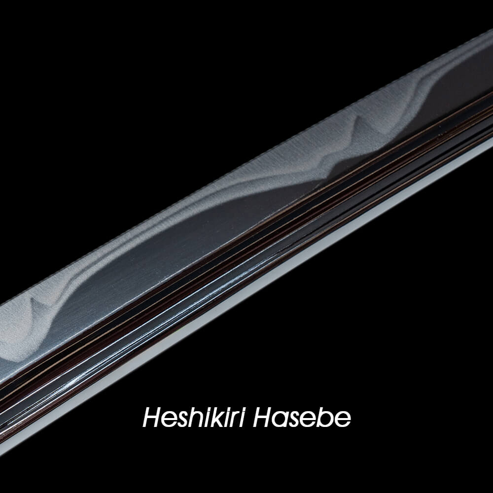 Dans le cas d'une lame en acier véritable, de l'argile est appliquée sur la lame avant le processus de refroidissement et la différence de dureté entre le bord et le reste de la lame résulte en cette ligne appelée "Hamon". Elle marque la transition entre la région de l'acier martensitique plus dur situé au bord de la lame et l'acier perlitique plus mou situé au centre et à l'arrière de l'épée. Cette différence de dureté est l'objectif de tout le processus ; l'apparence est purement un effet secondaire, mais le Hamon est devenu une caractéristique artistique très importante qui définit le niveau de maîtrise du forgeron. Les Iaito étant fabriqués à partir d’un alliage, le Hamon est imprimé en dépolissant la lame à l’aide de motifs spécifiques. Les artisans de Minosaka font de leur mieux pour reproduire les plus célèbres Hamon.